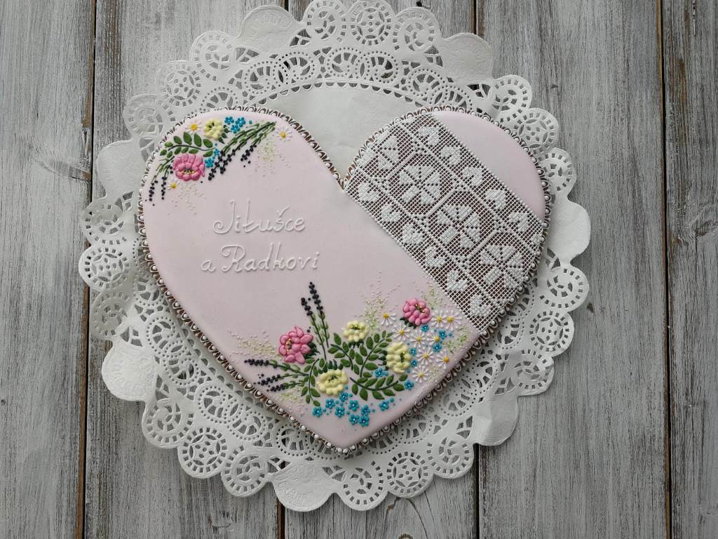 Ručně zdobené perníkové srdce na přání naší milé zákaznice jako dárek pro přátele.