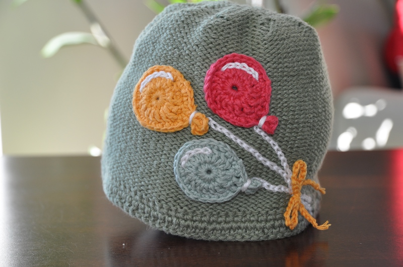 Trendová ručně pletená čepice s háčkovanou aplikací balónků je vhodná pro kojence a malé děti pro jaro / podzim .