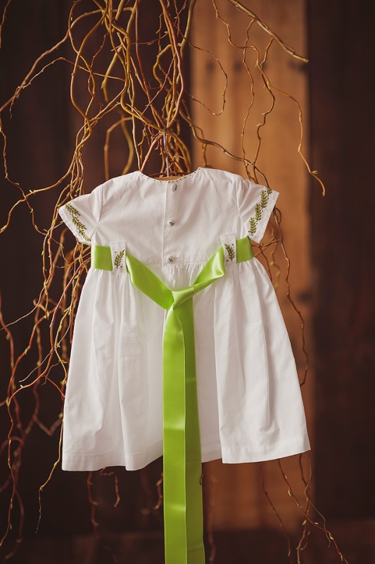 Slavnostní šaty s krátkým rukávem jsou vyrobeny z čisté bavlny. Jedná se o unikátní kus. Veškeré výšivky jsou dělány ručně za použití vysoce kvalitních vyšívacích přízí. Šaty se dají díky saténové mašli v pase libovolně upravovat podle postav holčičky.