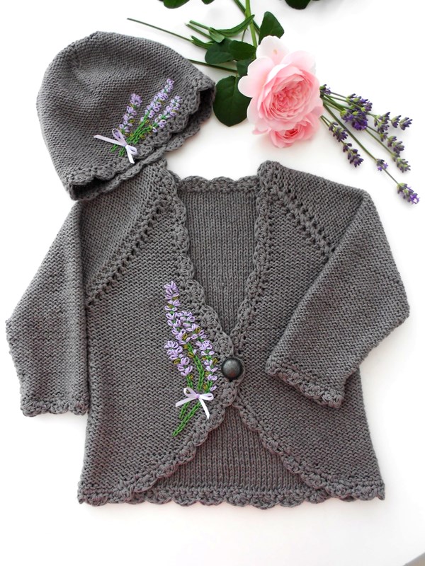 Dvoudílný set se skládá z čepičky a svetříku vepředu narozpínání. Oba kusy zdobí ruční výšivka levandule.