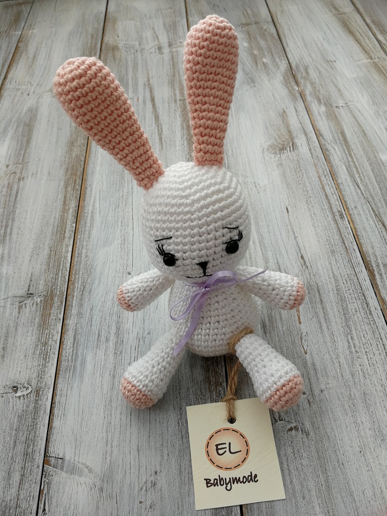 Háčkovaný zajíček je vyrobený z bavlněné příze s mírným leskem, která působí velmi hezky. Výplň tvoří duté vlákno.